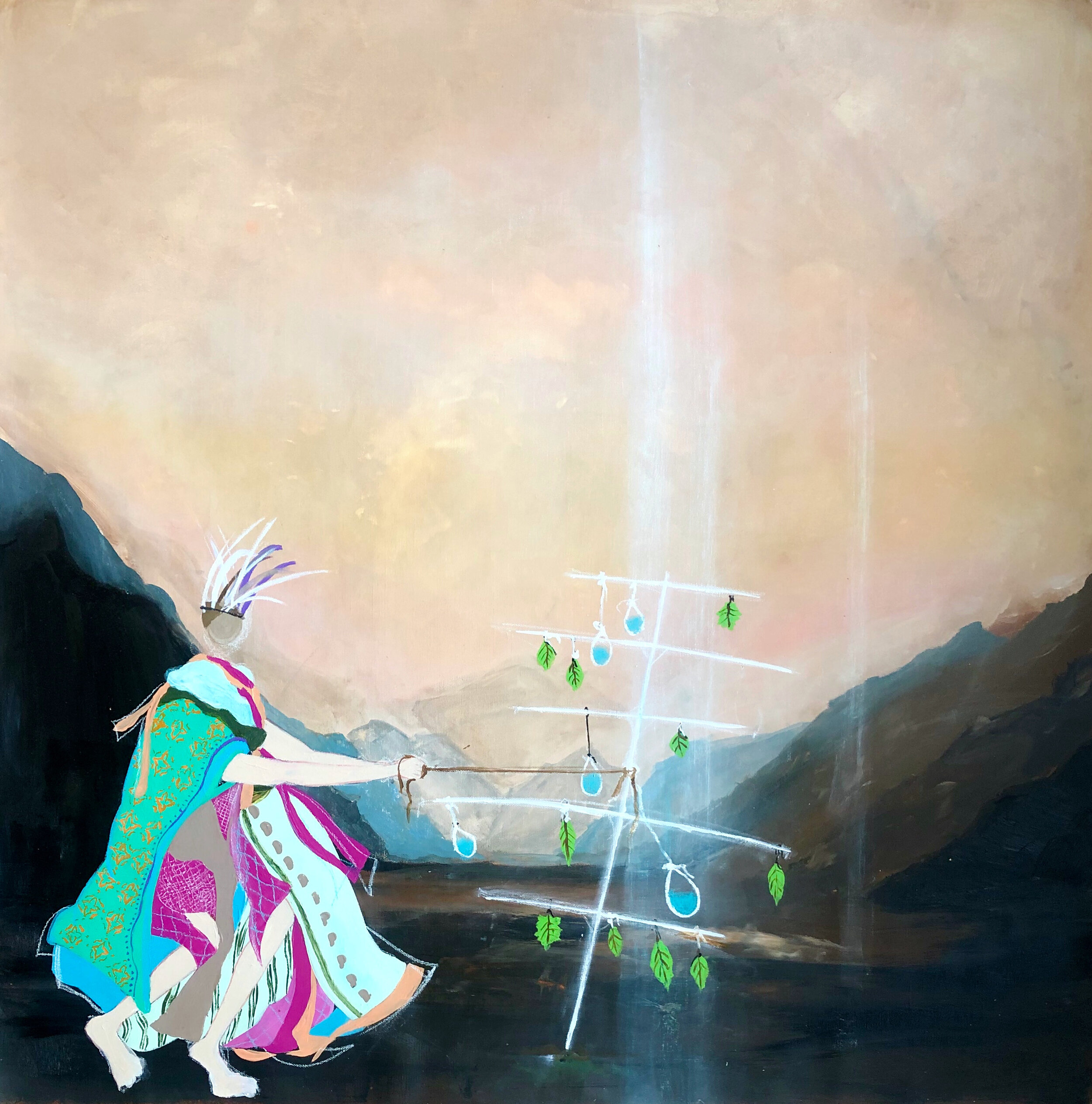 “A succession of mountain ranges shifts from green to black then green till there is nothing but light. The place is uneven and vast with curved edges like a recipient, like the palm of the hand holding a decanter for human minds and souls. Between earth and sky, there’s a bulls’ fight as night falls upon; and higher in the sky beyond a thin veil, the Awliya or friends of God in white faces rest at the hidden source of light”